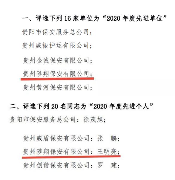 2021年的開年之際,貴州陟翔保安有限公司迎來了一個喜訊,公司被貴陽市保安協(xié)會授予2020年度“先進(jìn)單位”的榮譽(yù)稱號。同時,公司員工王明亮被授予2020年度“先進(jìn)個人”榮譽(yù)稱號。