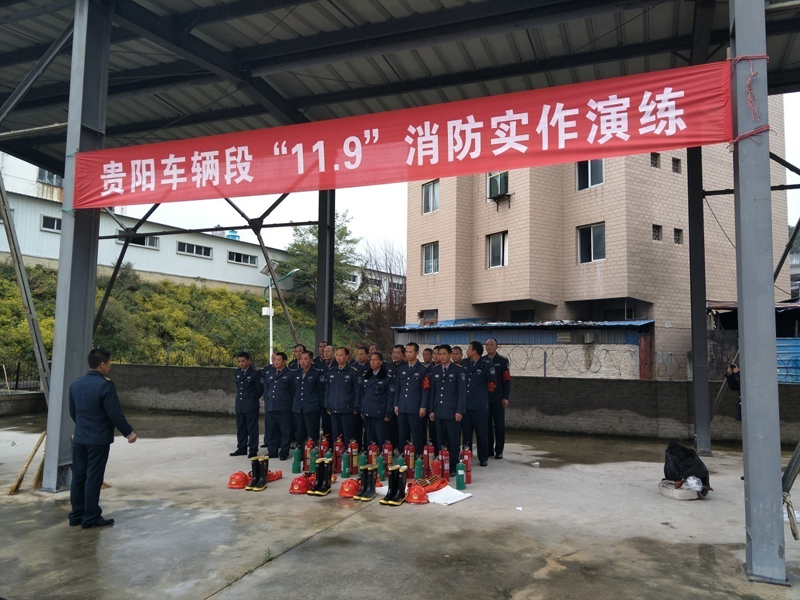 二、為切實(shí)加強(qiáng)我隊(duì)保安員消防安全意識(shí),增強(qiáng)防范、撲救火災(zāi)和逃生自救能力,按照“決戰(zhàn)四季度全力保平安”消防工作要求,結(jié)合我隊(duì)實(shí)際,于2016年11月9日14:30在后巢客車整備所和貴陽(yáng)北動(dòng)車所同時(shí)開(kāi)展“11.9”消防實(shí)作演練,駐車輛段、客運(yùn)段保安隊(duì)27人,駐車輛段動(dòng)車所保安隊(duì)26人參加演練,客戶單位80余人到場(chǎng)觀摩學(xué)習(xí),并由保安隊(duì)隊(duì)長(zhǎng)進(jìn)行教學(xué)演練。
