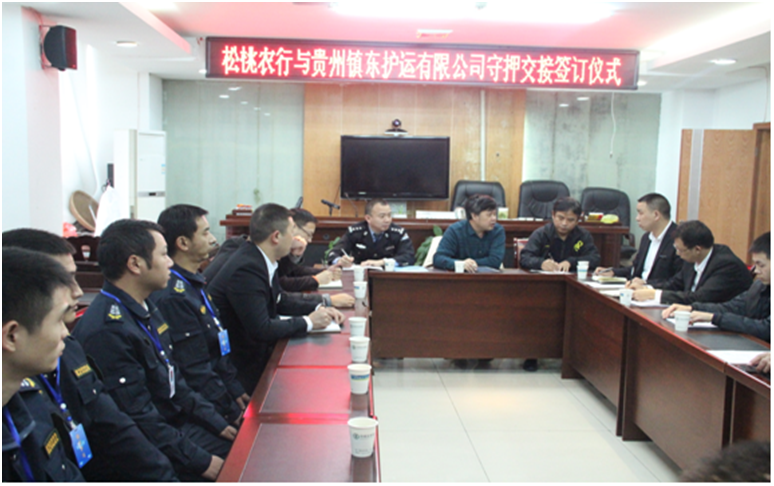 經(jīng)過半年的業(yè)務(wù)對接和洽談,銅仁本部于11月16日至20日正式接手德江、石阡、印江、江口、松桃五縣農(nóng)業(yè)銀行守押業(yè)務(wù)。銅仁市公安局保安大隊大隊長王世軍、銅仁市農(nóng)行副行長任達(dá)輝、銅仁市農(nóng)行保衛(wèi)部經(jīng)理楊猛、銅仁本部總經(jīng)理陳葉、副總經(jīng)理劉興華、劉樹等出席了五縣守押業(yè)務(wù)交接儀式。