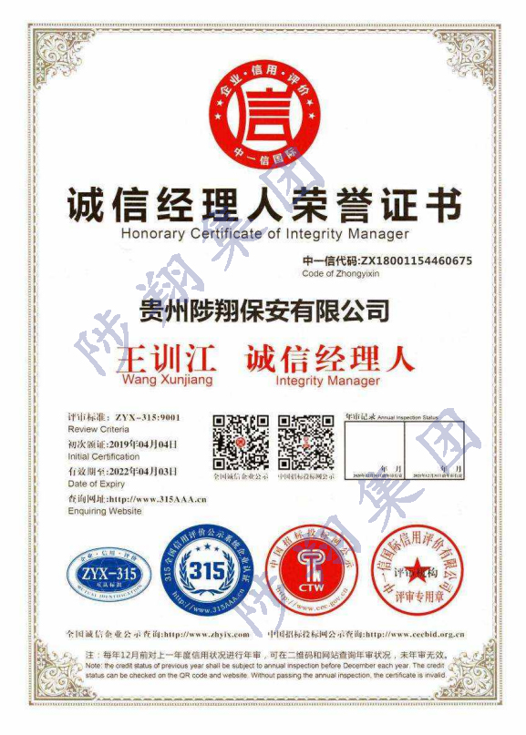 誠信經(jīng)理人榮譽證書
